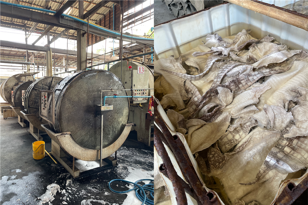 ■準備工程:原皮を鞣し工場へ運ぶため、塩漬け又は乾燥させる。鞣し工場では、皮を元の状態に戻す為に塩分や皮についた不要物を取り除く為に水に浸け、不要な鱗や脂肪分解の為、消石灰液に付けておく。その後の工程で綺麗に鞣せるよう薬品で石灰分、酵素でタンパク質を除去。